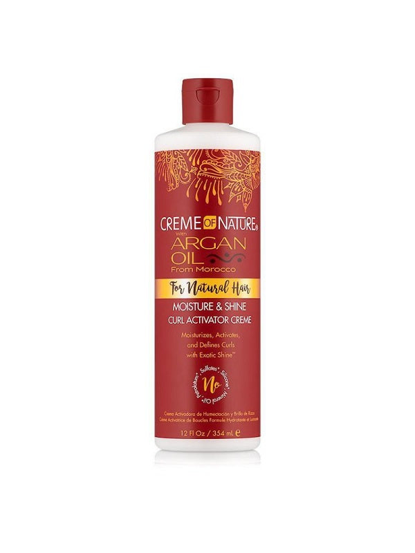Moisture & Shine Curl Activator creme de la marque Creme of Nature est faite à base d'huile d'Argan du Maroc, pour des cheveux naturels. Sa formule riche et crémeuse définit et lisse vos boucles tout en les rendant élastiques et rebondissantes. Cette crème hydratante et lustrante réduit également les frisottis tout en laissant vos boucles revitalisées et parfaitement hydratées. Elle apporte à vos coiffures (boucles, frisettes et ondulations), douceur au toucher et une brillance exotique.