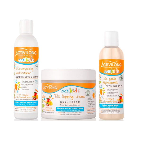 \nPour les faire briller dans toute leur splendeur, cette routine de soins Actikids met les boucles des enfants aux petits soins: nutrition intense grâce au beurre de mangue et l'huile d'amande douce, définition et sculpture des boucles pour une tenue impeccable.