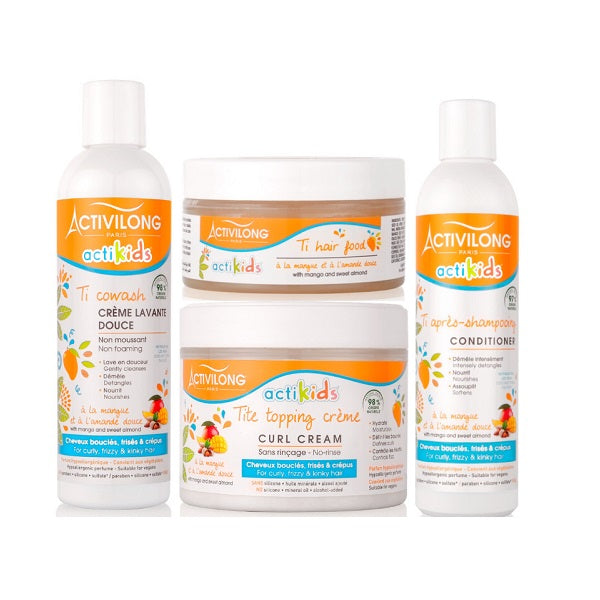 \nLes cheveux délicats des tout-petits, en particulier lorsqu'ils sont secs, ont besoin d'un maximum d'hydratation pour garder leur douceur et leur éclat naturels. Ce programme Actikids réussit exactement dans cette tache en proposant un cocktail d'huile d'amande douce et de beurre de mangue, pour désaltérer puis sceller l'hydratation des cheveux.