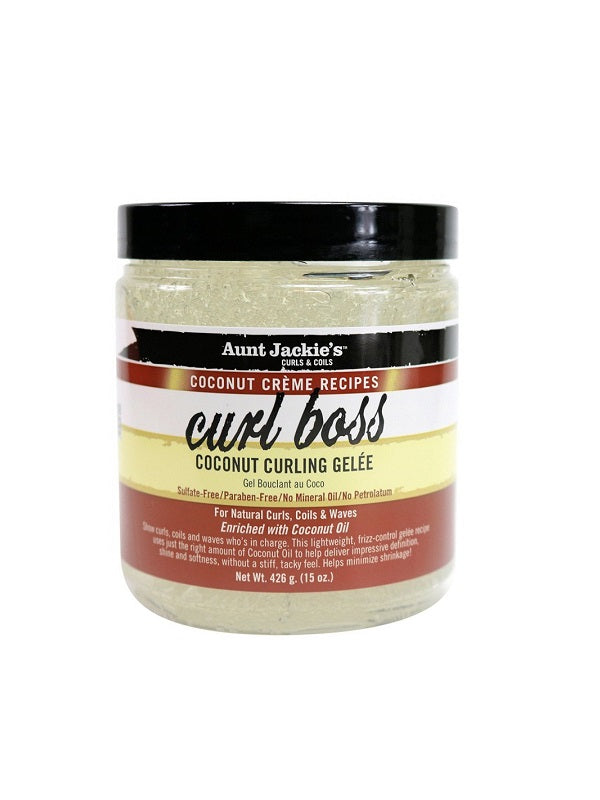 \nCurl Boss est un gel bouclant à l’huile de coco, spécialement formulé pour vous permettre de sculpter et maintenir de belles boucles, bobines ou vagues, le tout sans agresser la fibre capillaire. Curl Boss hydrate vos cheveux et les débarrasse des frisottis, transfigurant vos boucles pour les rendre à la fois plus douces, plus souples et plus éclatantes sans effet carton. Ce gel d’Aunt Jackie’s est adapté aux cheveux ondulés, bouclés ou frisés qui ont besoin d’être légèrement et durablement hydratés. Formulé sans sulfate, sans parabène, sans huiles minérales et sans petrolatum.
