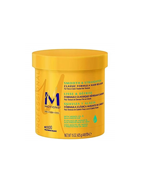 Motions no base relaxer est substantif au cheveu et le protège lors du processus de défrisage.