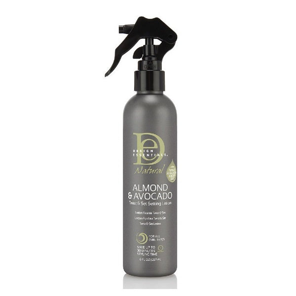 \nLa lotion ALMOND AVOCADO Twist and Set Setting Lotion de DESIGN ESSENTIALS est enrichie en vitamines, protéines et ingrédients d'origine végétale. Elle favorise l'hydratation parfaite de vos cheveux tout en formant des boucles naturelles. Cette lotion coiffante est pratique et rapide et permet de démêler vos cheveux tout en leur donnant un éclat plus soyeux. Utilisée sur les textures de cheveux naturels bouclés à étroitement enroulés, elle maintient votre coiffure pendant une longue durée et réduit les frisottis. La lotion Twist and Set Setting Lotion de DESIGN ESSENTIALS garantit une tenue moyenne et redonne aux cheveux leur brillance naturelle et leur douceur.
