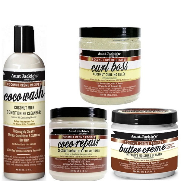 \nLe lait de coco est un ingrédient précieux pour tout rituel capillaire visant à redonner du peps à des cheveux secs, dévitalisés et abîmés. Ce programme au lait de coco d'Aunt Jackie's arrive donc à point nommé!