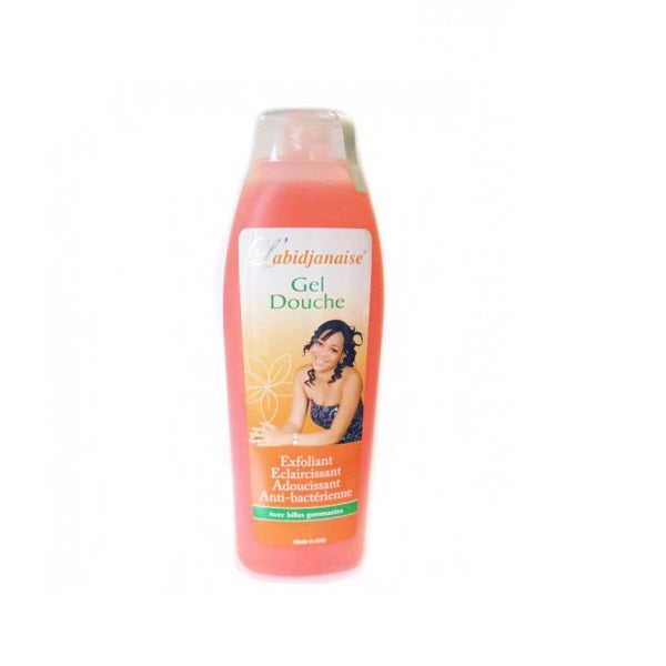 Gel douche l’abidjanaise exfoliant, éclaircissant, adoucissant, anti-bactérienne. Incontournable pour les peaux ternes et tous types de peau, le gel douche moussant l'abidjanaise est enrichi aux propretés exfoliantes et adoucissantes. Les fines billes qu'il contient, gomment délicatement les cellules mortes de votre peau en vous procurant une sensation de fraicheur et de doucet toute la journée