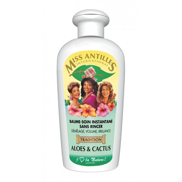 \nassociant l'action de l'Aloes à celui du cactus, le Baume-Soin Instantané Aloès et Cactus de la marque Miss Antilles a à la fois une texture légère et douce qui fond instantanément sur la chevelure qui devient douce et soyeuse.