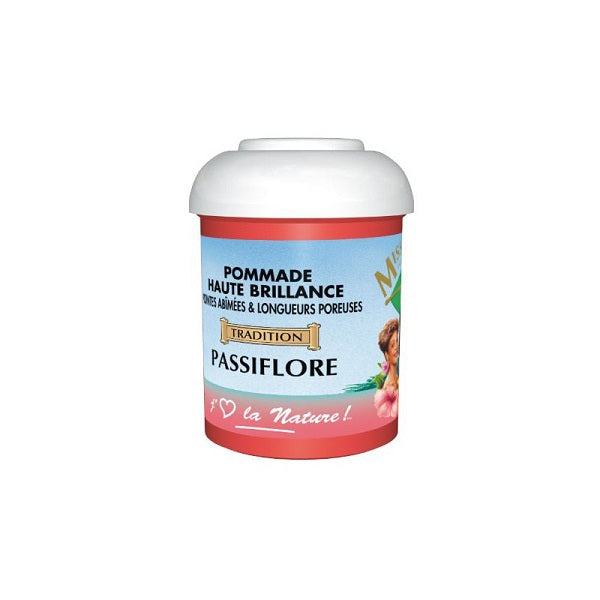 \nLa Pommade Haute Brillance Passiflore est un produit naturel riche en vitamine F qui nourris la peau et le cuir chevelu. les silicones spécifiques qu'elle contient lissent la cuticule et enrobent chaque cheveu d'un film protecteur. le peigne glisse facilement dans les cheveux devenus doux, dociles et brillants.