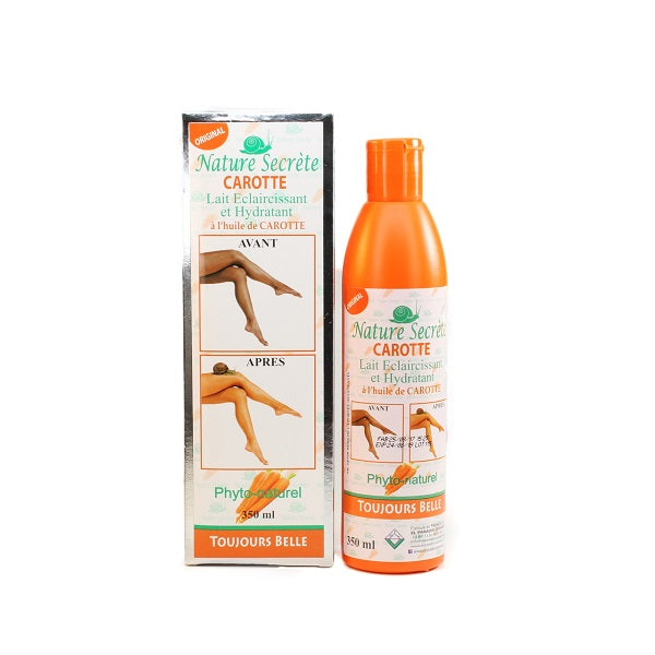 Le lait éclaircissant de la marque NATURE SECRÈTE, à base d'huile de carotte et à la bave d'escargot. Illumine le teint et lutte contre les taches sombres du teint.