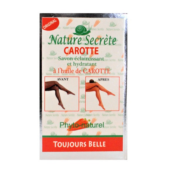 Le savon éclaircissant de la marque NATURE SECRÈTE, à base d'huile de carotte et à la bave d'escargot. Il nettoie, exfolie et tonifie la peau.