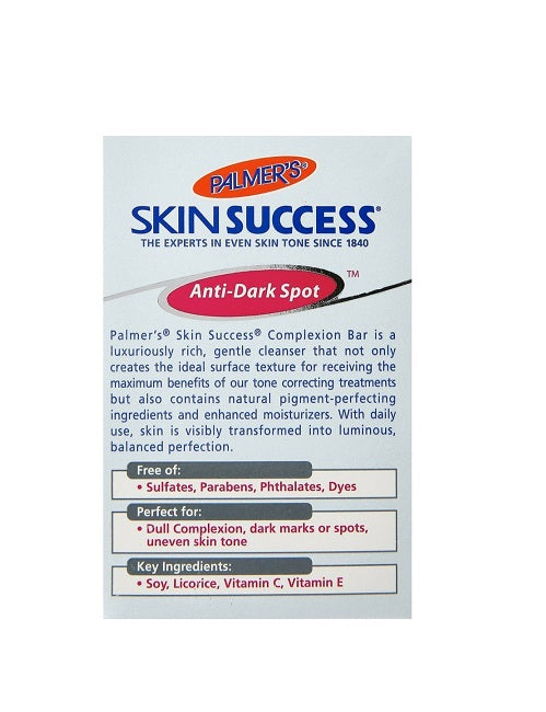 Palmer's Skin Success Anti Dark Spot Complexion Bar est une barre faciale crémeuse qui purifie, éclaircit et équilibre le teint doucement. Les ingrédients correcteurs de tonalité et les hydratants naturels se combinent même avec un toucher cutané et un nettoyage en profondeur sans sécher la peau. Assez doux pour un usage quotidien. \nLe produit reçu peut différer temporairement de l'image affichée en raison des mises à jour de l'emballage.