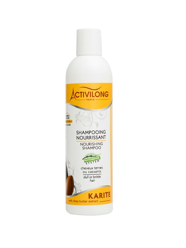 \nLe Shampooing Nourrissant Activilong au Karité nourrit le cheveu tout en restaurant les longueurs ternes et cassantes. \n \nLes cheveux sont brillants et en pleine santé. \n \n[Sans paraben - Sans silicone - Anticalcaire]