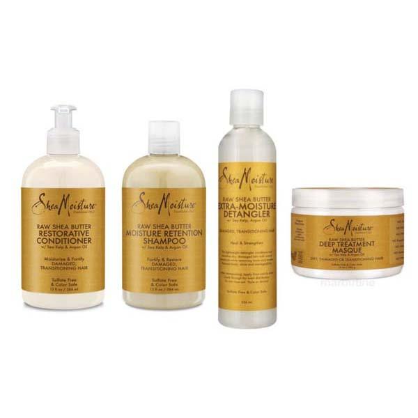 Le pack de la gamme Shea Moisture Shea Butter enrichie au beurre de karité, nourrit intensément les cheveux bouclés, frisés et crépus. Ce pack contient 4 produits pour une routine complète : un shampoing, un après-shampoing, un masque et un lait démêlant.