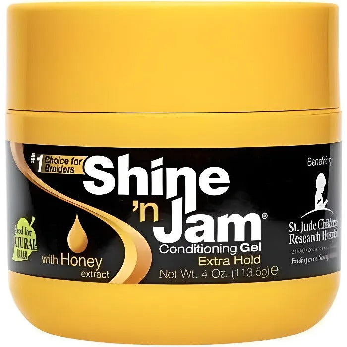 \nShine’N Jam Extra Hold - Le MEILLEUR gel sur le marché : sans alcool, parabènes, cire, pétrolatum et silicones. Ce gel hydratant et non desquamant a une tenue ferme et non grasse. Amélioré avec de l'extrait de miel pour aider à renforcer les cheveux. Idéal pour les waves, les tresses, les locks, les twists ou tout style que votre cœur désire !
