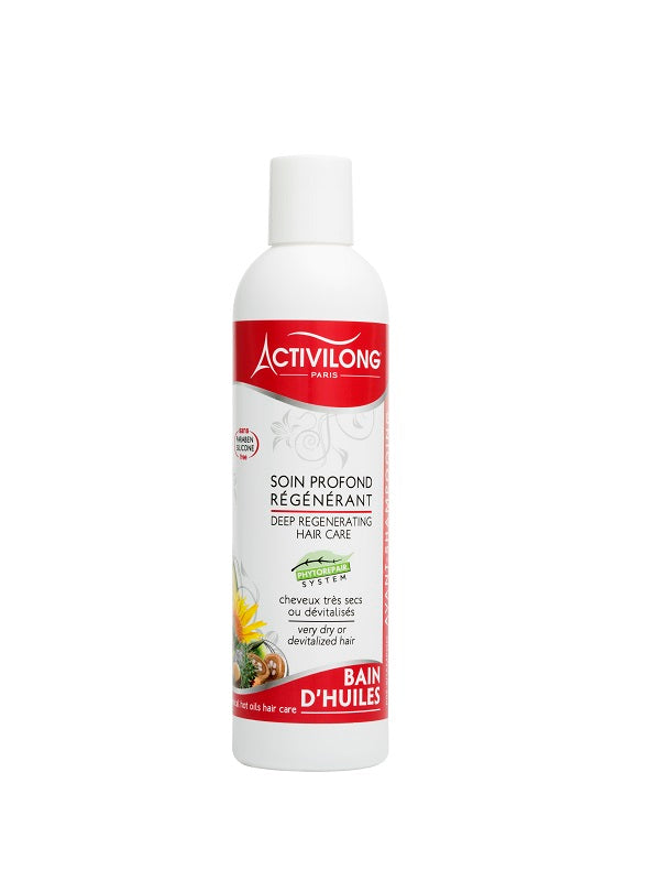 \nLa haute teneur en huiles végétales naturelles vitaminées du Soin Profond Régénérant Activilong offre une seconde vie aux chevelures desséchées et abîmées. \n \nIl nourrit et normalise les états squameux des cheveux pour les aider à retrouver un aspect sain et naturel.